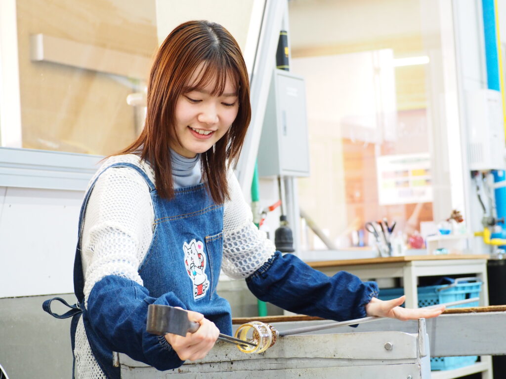 息を吹き込みながらつくる吹きガラスは小学4年生から、表面をなでながら形を整えていくペーパーウェイトは小学1年生から体験できます。