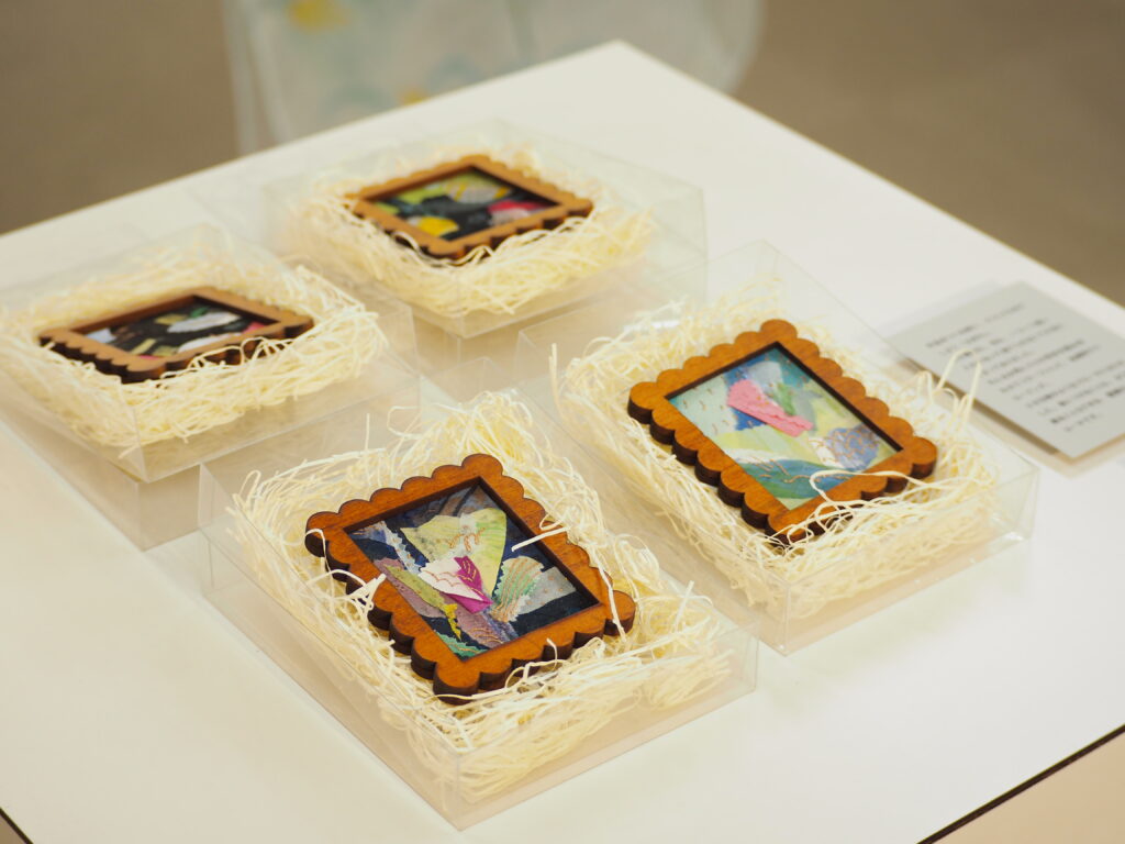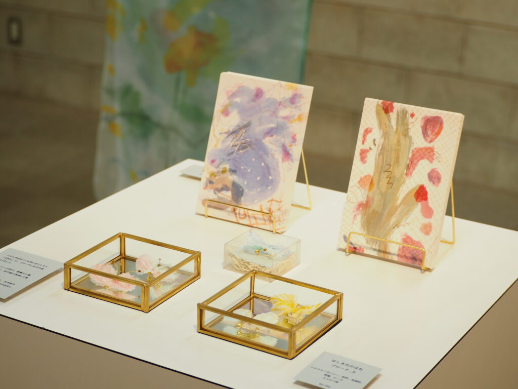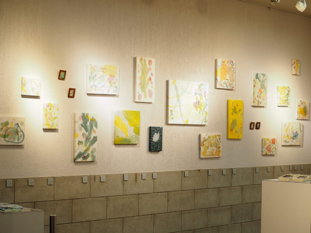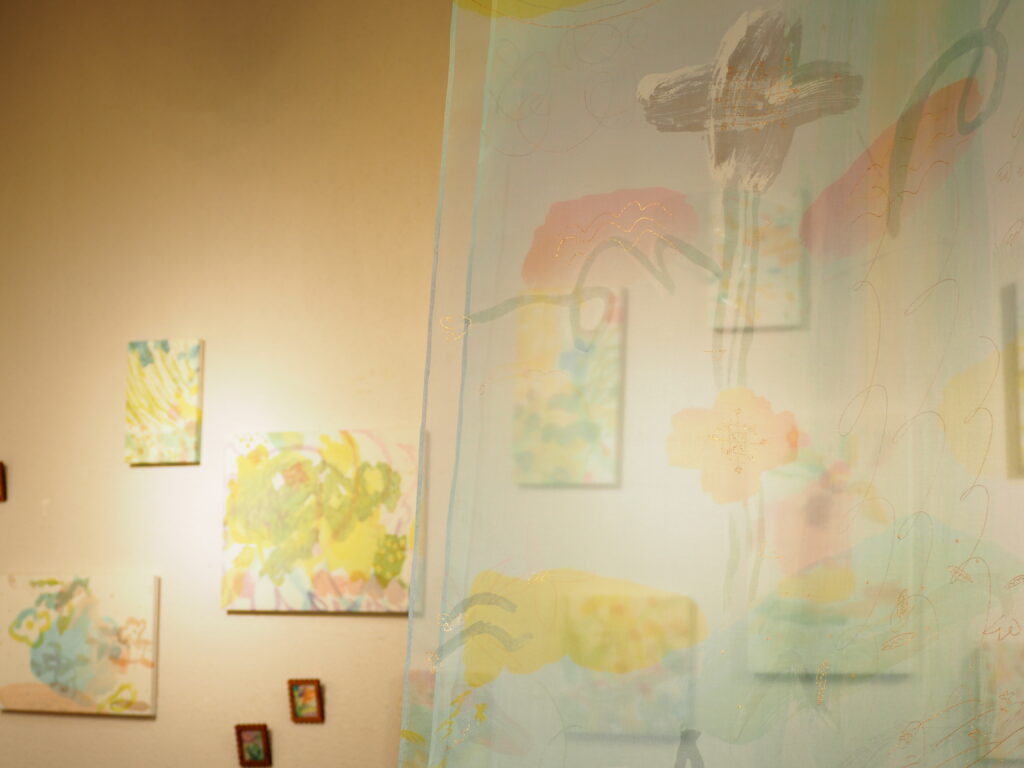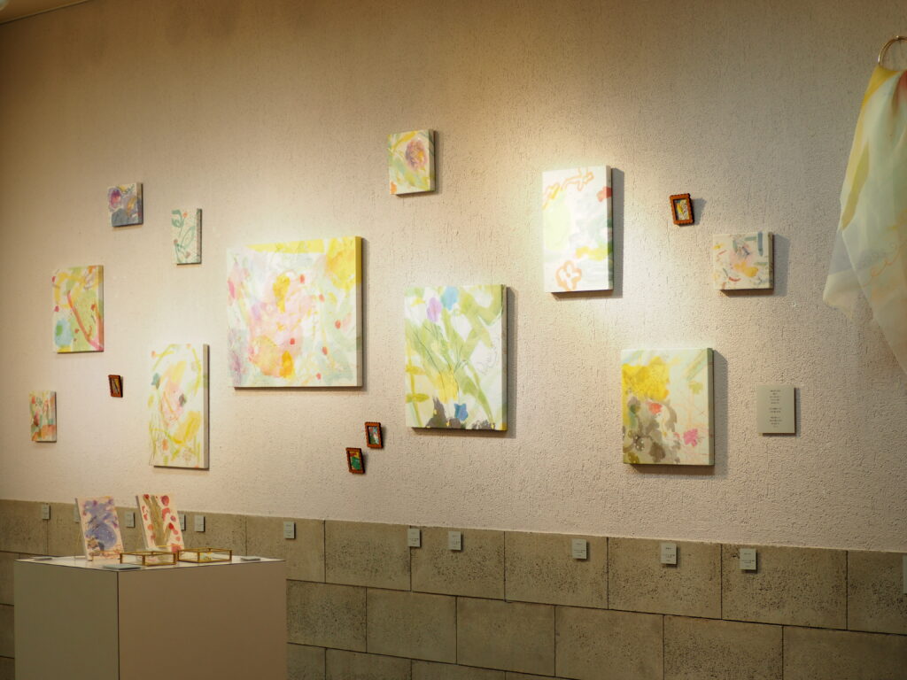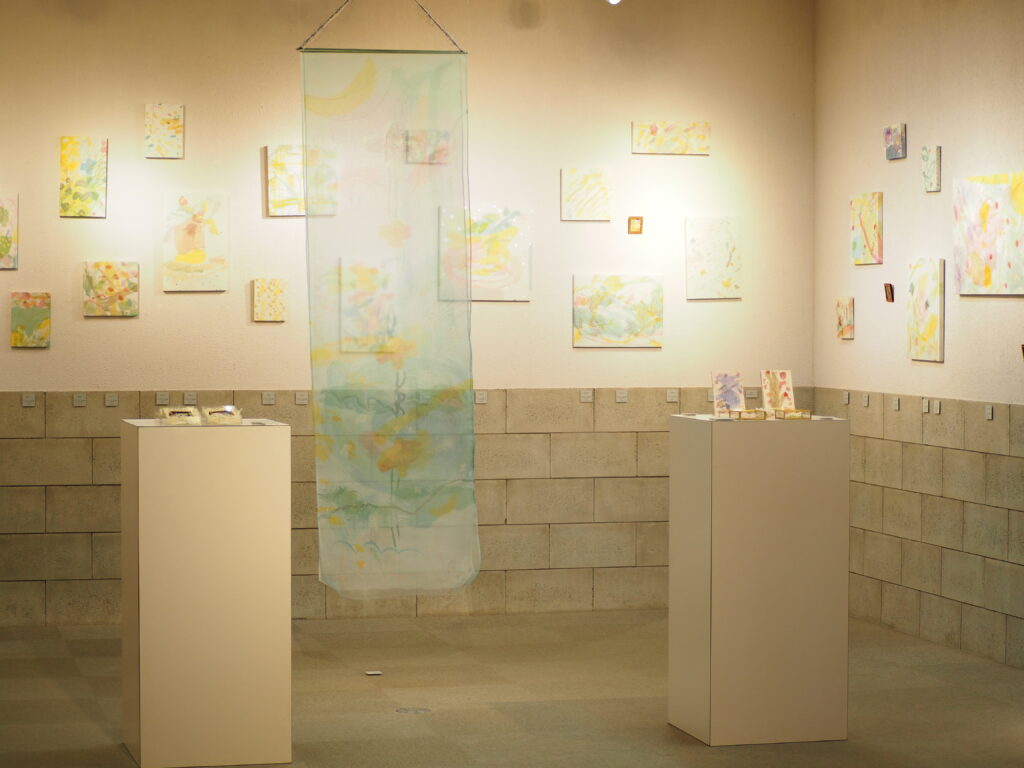 日々の瑞々しい景色をモチーフにした「ろうけつ染」の作品が並びます。