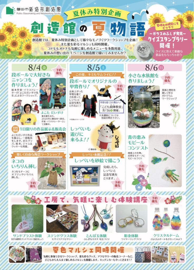 夏休み特別企画『創 造 館 の 夏 物 語』 2023.06.30 Tweet Share この記事のタイトルとURLをコピーする 開催日: 2023年8月4日 - 2023年8月6日カテゴリー: イベント Tweet Share 酒井真一 松浦あかねガラス作品展 前の記事 吹きガラス体験A日程(午前・午後開催日) 次の記事